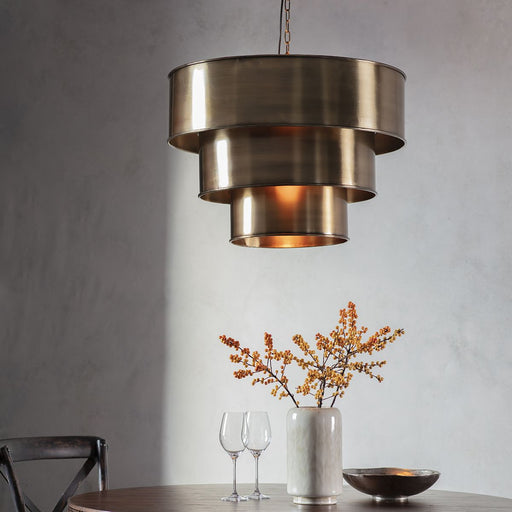 HoF IlluminationsOnly 4 left!Dimensions: (w)500mm x (d)620mm x (h)750mm Information A truly unique pendant light formed from 3 cylindrical tiered shades, all hanging from a met...