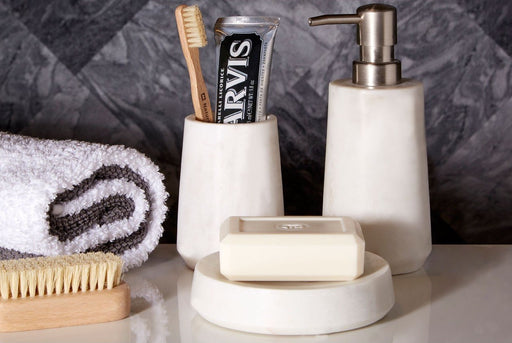 HoF Living5+ in stockMarble Toothbrush Holder Dimensions: H11cm x W13cm x D8cm. Click below for matching set Marble Cotton Jar Marble Soap DishMarble DispenserMarble To...